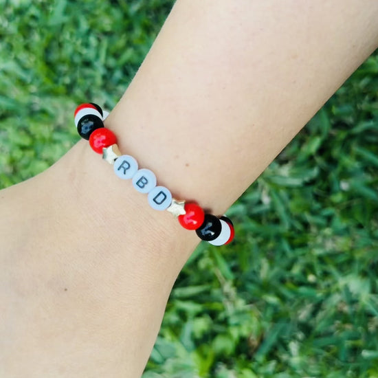 Pulsera para Mujer hecho de Elástica en color Rojo, Blanco y Negro con Cuentas RBD Estrellas Doradas.